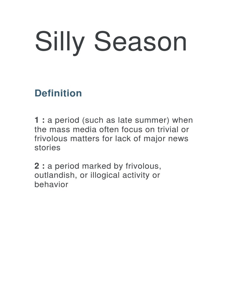 Definition of a silly-season in the Idioms Dictionary. Meaning pronunciation translations and examples. Noun a time usually late summer characterized by exaggerated news stories about frivolous matters for want of real news.