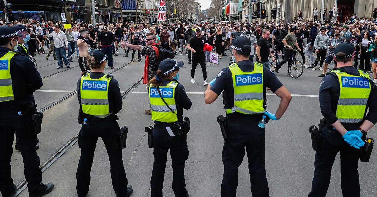 Melbourne anti-lockdown rally. Authorities had deemed the protest a potential superspreader event for Victoria which on Saturday recorded 535 new local Covid-19 cases. Some 2000 officers will be deployed during Saturdays operation which will involve road checkpoints barricades and roving patrols.